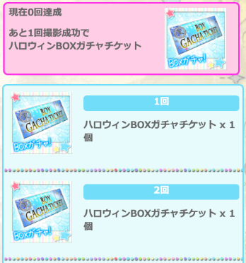 到達報酬は、「スペシャルゲストの撮影成功回数が一定数に達するごとに、BOXガチャチケットをもらえる」という仕様です。