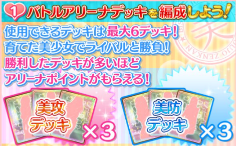 バトルアリーナでは、『美攻デッキ×3』と『美防デッキ×3』の計6つのデッキを利用してバトルが行われます。