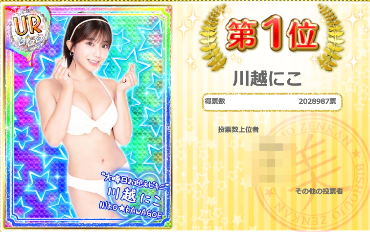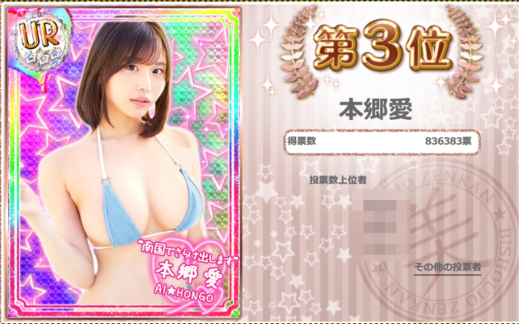 また、今回の「美少女別ランキング」と「美少女カード別ランキング」の2種類がありますが、どちらもTOP3の順位は同じでした。
