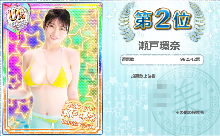 現在の投票数は約84万票で、2位の瀬戸環奈さんとは僅差です。