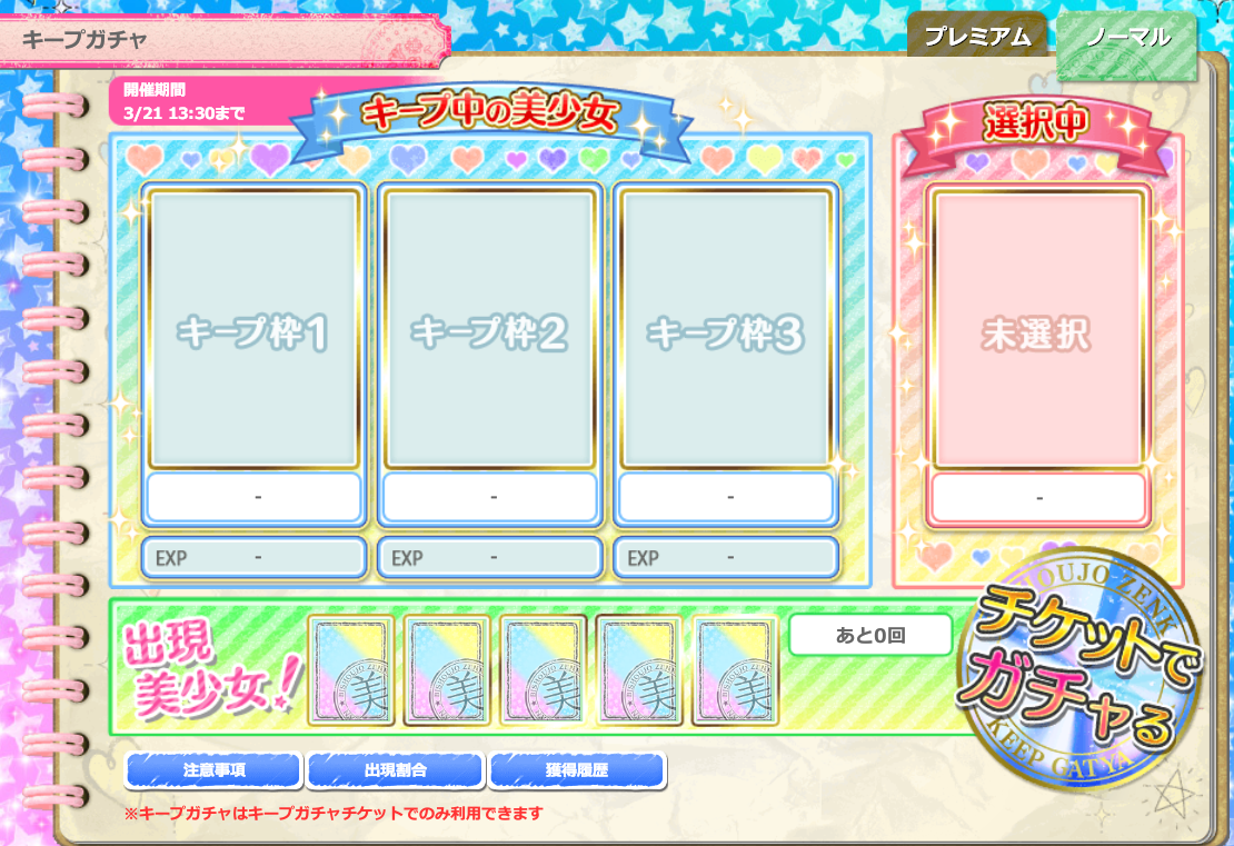 ガチャは『ノーマル』と『プレミアム』の2種類があり、それぞれ出現する美少女やチケットの入手方法が異なります。