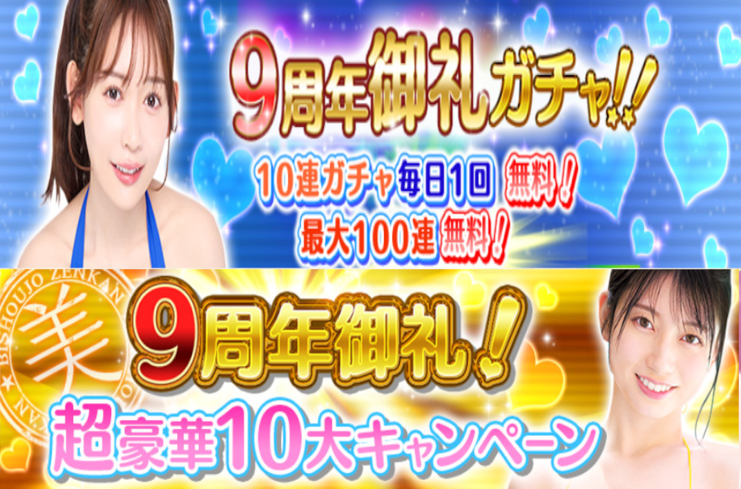 引いた分だけ豪華な報酬がGETできるため、9周年をお祝いしながら、ミスコン撮影会を周回してガチャチケットを集めまくりましょう!