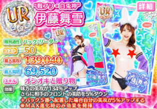 また「今回の注目美少女」で紹介されているUR美少女は、新規コラボ美少女である「”戦プリ・安倍晴明” 川越にこ」と、去年の戦プリコラボで登場した「”戦プリ・白兎神” 伊藤舞雪」の2種類のみです。