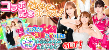 今回のコラボ美少女である「ゆあ&みなみ&えいみ」は、ログイン&イベントのみで最大進化が可能です。